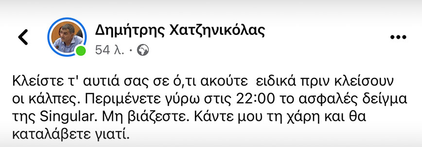 Ειδικότερα, ο κ. Χατζηνικόλας γράφει χαρακτηριστικά: «Κλείστε τ’ αυτιά σας σε ό,τι ακούτε, ειδικά πριν κλείσουν οι κάλπες. Περιμένετε γύρω στις 22:00 το ασφαλές δείγμα της Singular. Μη βιάζεστε. Κάντε μου τη χάρη και θα καταλάβετε γιατί».