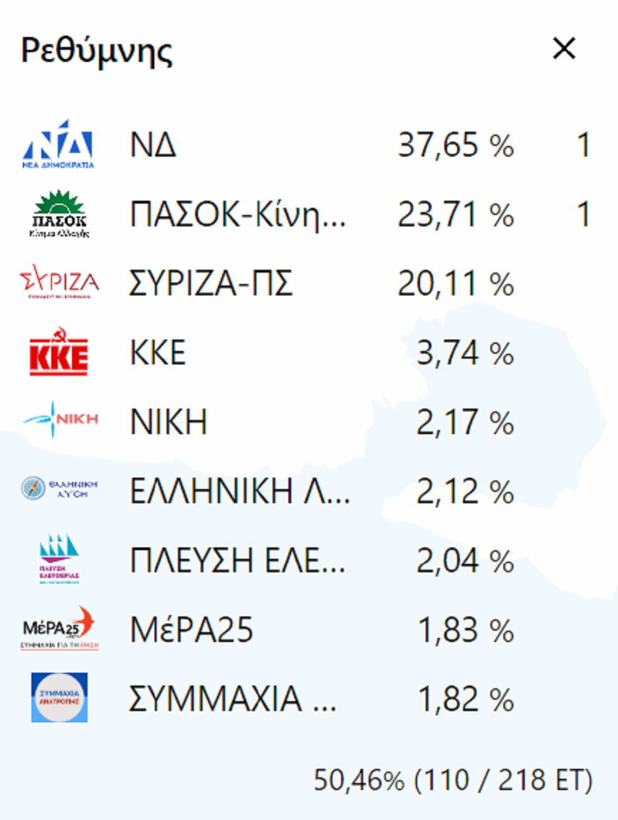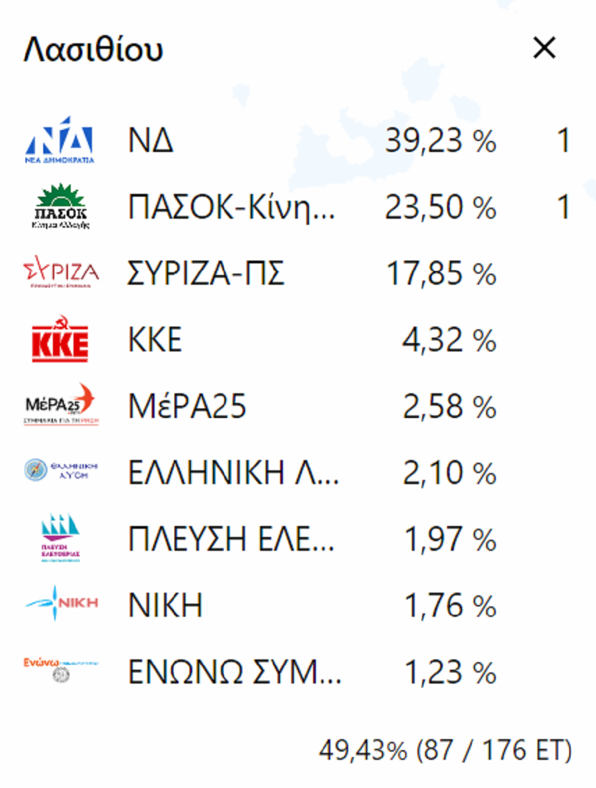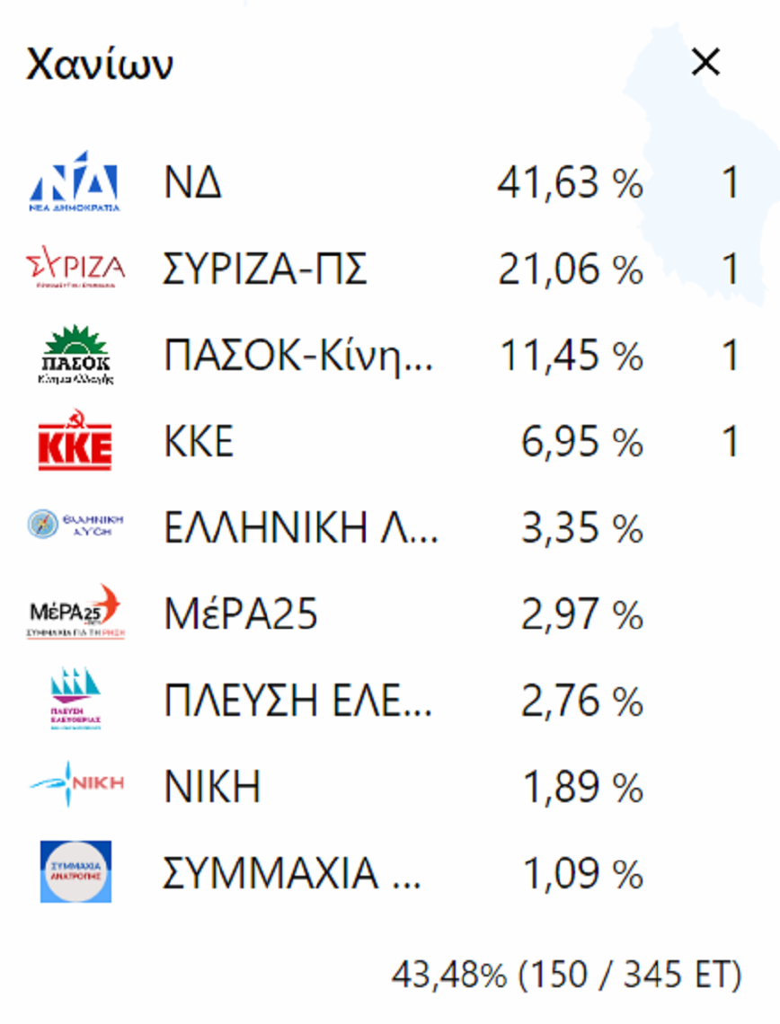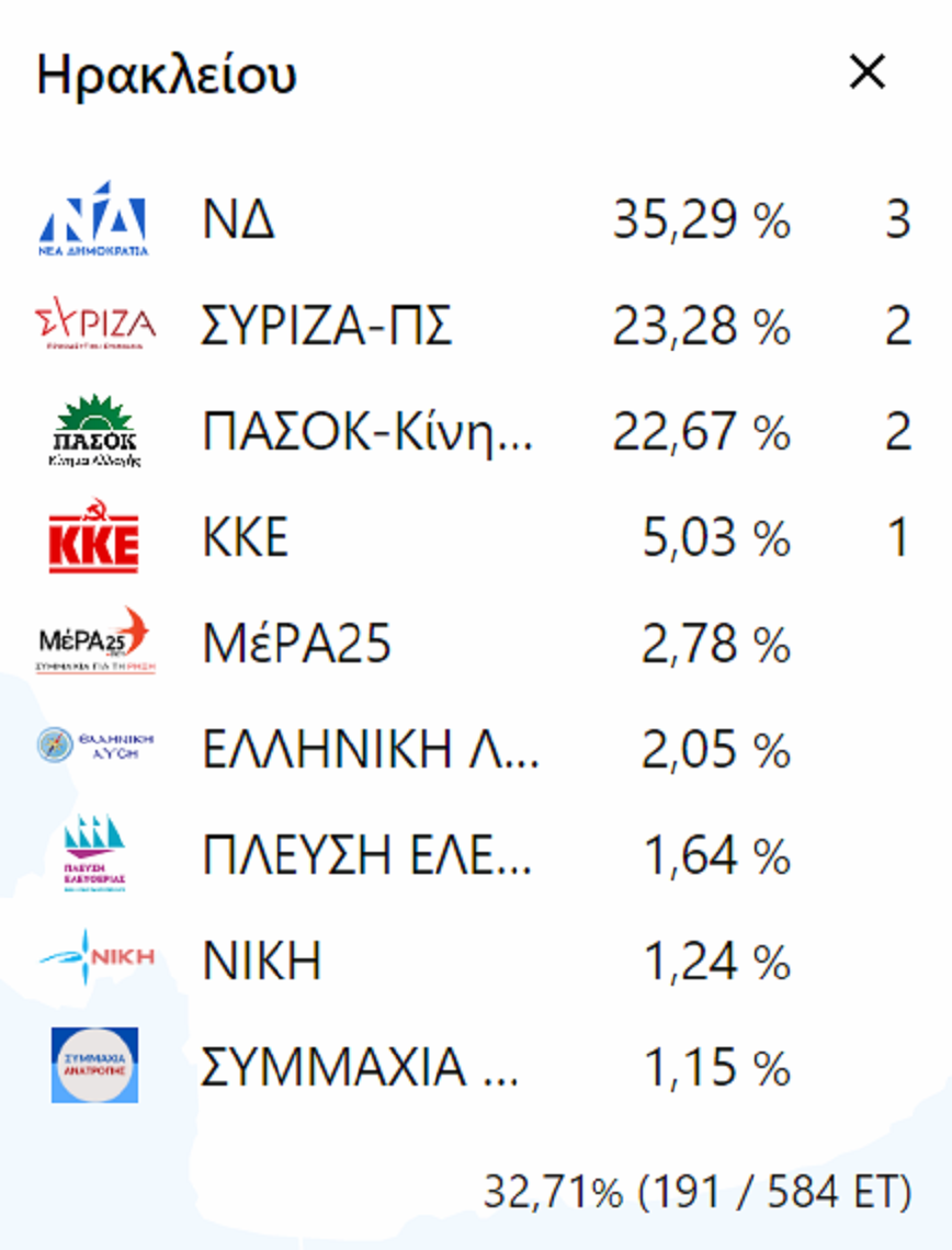 Η Νέα Δημοκρατία αναδεικνύεται πρώτο κόμμα στην Κρήτη, με βάση τα στοιχεία του υπουργείου Εσωτερικών για τις εκλογές, ενώ ΠΑΣΟΚ και ΣΥΡΙΖΑ κοντράρονται σθεναρά σε ορισμένες περιοχές.