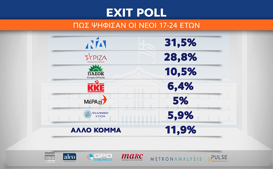 Σύμφωνα με την εκτίμηση του exit poll που διενεργήθηκε για λογαριασμό των τηλεοπτικών σταθμών πανελλαδικής εμβέλειας, οι νέοι έδωσαν 31,5% στη Νέα Δημοκρατία, 28,8% στον ΣΥΡΙΖΑ – Προοδευτική Συμμαχία, 10,5% στο ΠΑΣΟΚ – Κίνημα Αλλαγής και 6,4% στο Κομμουνιστικό Κόμμα.