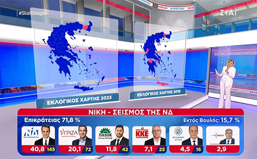 Τον θρίαμβο της Νέας Δημοκρατίας και τη συντριβή του ΣΥΡΙΖΑ καταδεικνύει η σύγκριση των δυο χαρτών των εκλογών του 2023 και του 2019, αλλά και των ποσοστών των δύο κομμάτων.