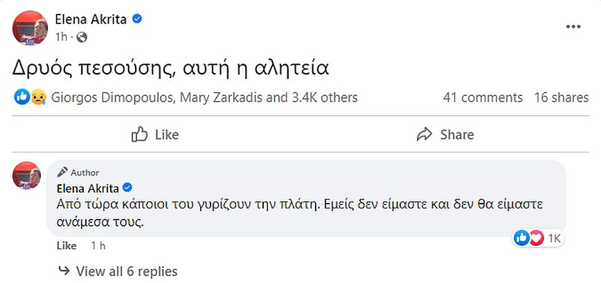 Τη συντριπτική ήττα του ΣΥΡΙΖΑ στις εκλογές σχολίασε στα κοινωνικά δίκτυα η -εκλεγμένη πλέον- βουλευτής Επικρατείας του ΣΥΡΙΖΑ, Έλενα Ακρίτα.