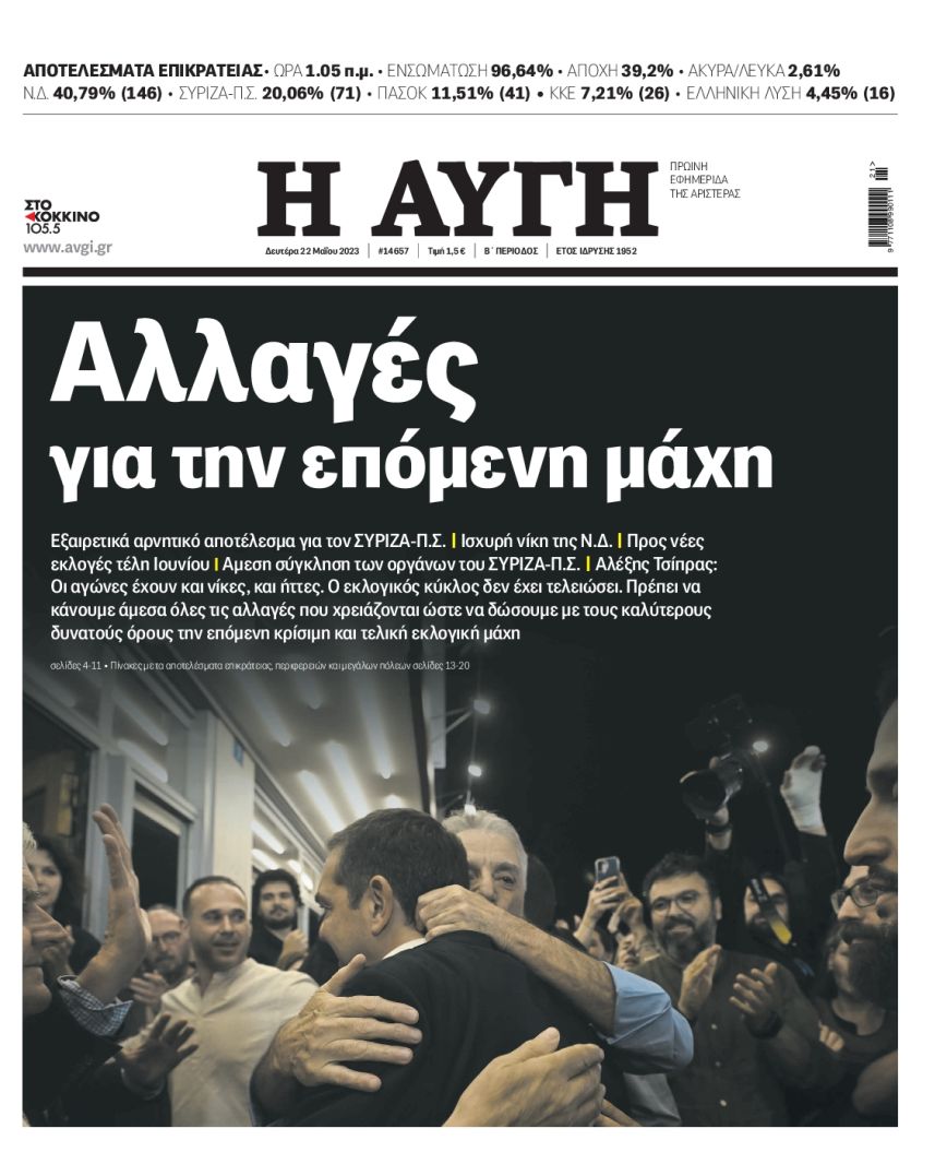 «Αλλαγές για την επόμενη μάχη – Εξαιρετικά αρνητικά αποτελέσματα για τον ΣΥΡΙΖΑ – ΠΣ» γράφει η Αυγή.