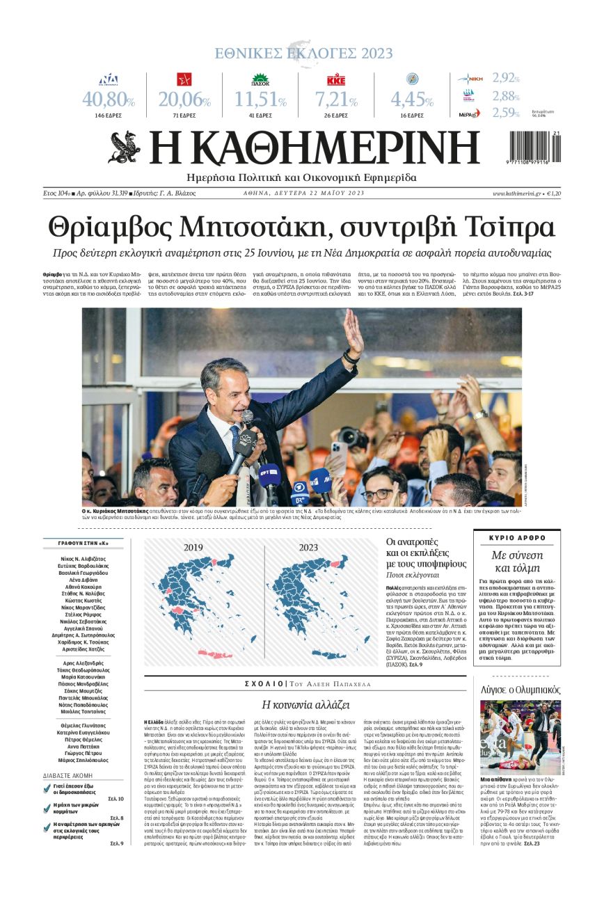 «Θρίαμβος Μητσοτάκη – Συντριβή Τσίπρα» είναι ο πρωτοσέλιδος τίτλος της Καθημερινής.