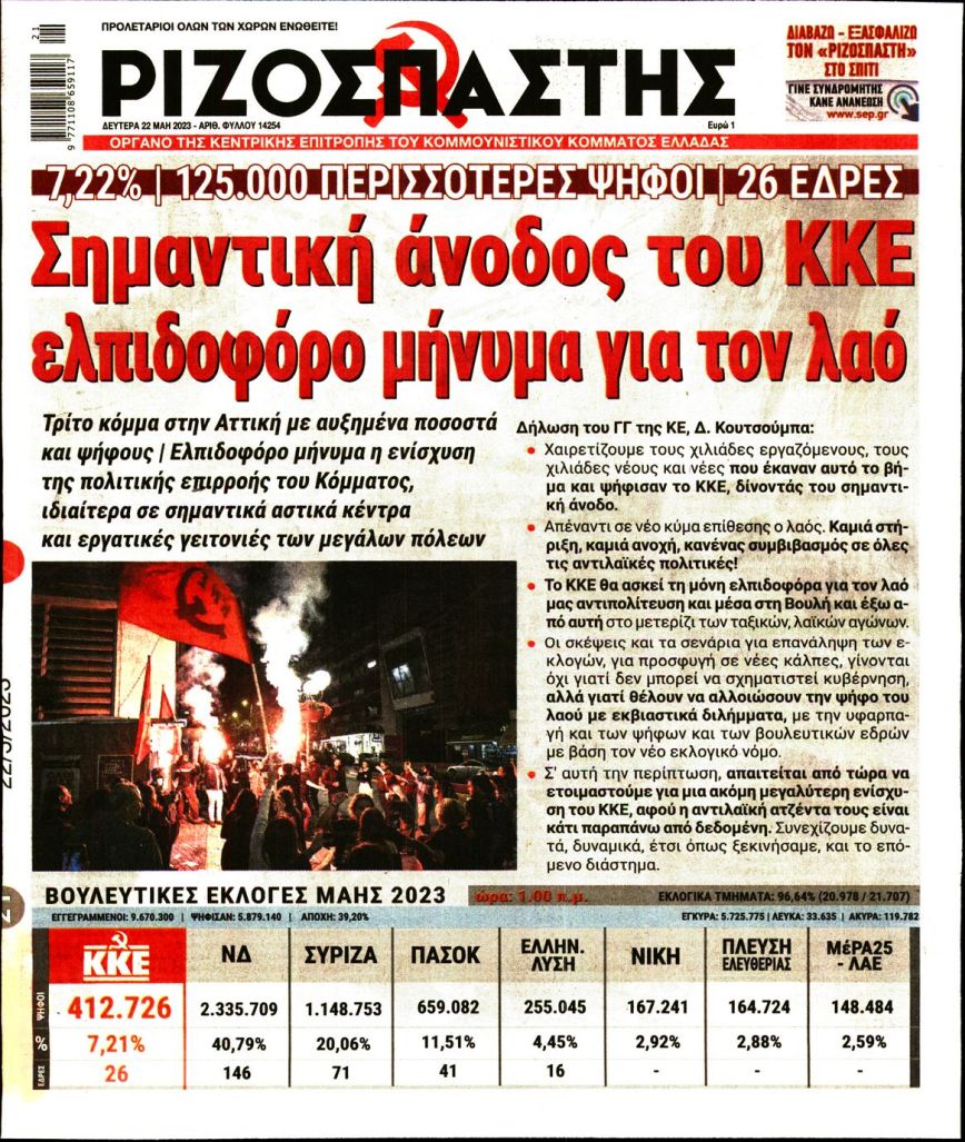 «Σημαντική άνοδος του ΚΚΕ ελπιδοφόρο μήνυμα για τον λαό» ο τίτλος στον Ριζοσπάστη.