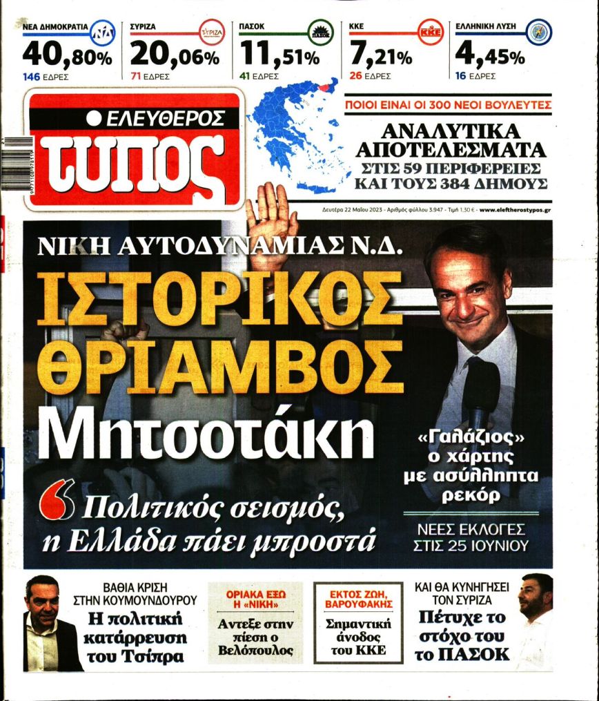 «Ιστορικός θρίαμβος Μητσοτάκη» γράφει ο Ελεύθερος Τύπος.
