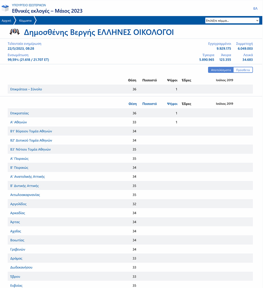 Το τελικό αποτέλεσμα (100%) των εκλογών 2023 αναμένονται εντός της ημέρας και με βάση τα μέχρι στιγμής στοιχεία (ενσωμάτωση 99,59%), η Νέα Δημοκρατία προηγείται στις εκλογές 2023 συντριπτικά με 40,79%, ακολουθεί ο ΣΥΡΙΖΑ με 20,07%, το ΠΑΣΟΚ Κίνημα Αλλαγής με 11,46% και η Ελληνική Λύση με 4,45%.