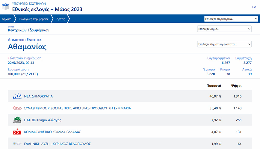 Ειδικότερα στη Δημοτική Ενότητα Αθαμανίας η Νέα Δημοκρατία συγκέντρωσε ποσοστό 40,87% (1.316 ψήφοι), έναντι του 35,40% που κατέγραψε ο ΣΥΡΙΖΑ (1.140 ψήφοι).