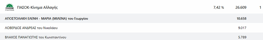 Η Μιλένα Αποστολάκη κατάφερε να κερδίσει τη μοναδική έδρα του ΠΑΣΟΚ στον Β’ Τομέα Αθηνών, αφήνοντας στη δεύτερη θέση τον Ανδρέα Λοβέρδο και εκτός Βουλής για πρώτη φορά.