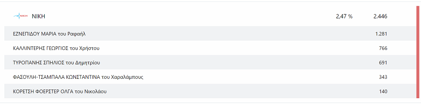 Συγκεκριμένα, το κόμμα «Νίκη» πήρε 2.446 ψήφους στα Ιωάννινα και με την ενσωμάτωση των σταυρών να είναι στο 92,35% (471 από τα 510 εκλογικά τμήματα), 1.281 άτομα επέλεξαν τη Μαρία Εζνεπίδου.