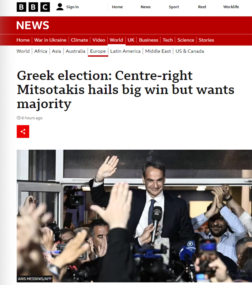 Το BBC κάνει λόγο για «πολιτικό σεισμό». Στέκεται στο γεγονός ότι ο χάρτης της επικράτειας έχει βαφτεί μπλε, με εξαίρεση τη Ροδόπη, σημειώνοντας πως το αποτέλεσμα αυτό αποτελεί «τεράστιο πισωγύρισμα» για τον αρχηγό του ΣΥΡΙΖΑ, Αλέξη Τσίπρα. «Οι Έλληνες φαίνεται πως αντέδρασαν θετικά, περισσότερο από όσο αναμενόταν, υπογραμμίζει το βρετανικό δίκτυο. Σημειώνει επίσης πως η κεντροδεξιά κυβερνά την Ελλάδα τα τελευταία τέσσερα χρόνια και έχει καταφέρει ανάπτυξη κοντά στο 6%, ενώ τονίζει πως η πρόταση του κ. Μητσοτάκη προς τους πολίτες ότι μόνο αυτός θα μπορούσε να οδηγήσει την ελληνική οικονομία προς τα εμπρός και να εδραιώσει την πρόσφατη ανάπτυξη, είχε αποτέλεσμα.