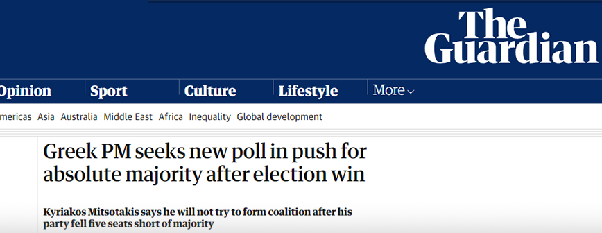 Η Guardian επισημαίνει πως η διαφορά των 20 ποσοστιαίων μονάδων είναι ένα «σπάνιο» γεγονός για την Ελλάδα, ενώ υπογραμμίζει πως ακόμη και στο «σοσιαλιστικό προπύργιο» της Κρήτης η ΝΔ τα πήγε απρόσμενα καλά. Αναφέρεται επίσης στην καλή επίδοση του ΚΚΕ αλλά και στην αποτυχία του κόμματος Βαρουφάκη να μπει στη Βουλή. Οι Έλληνες φαίνεται πως ψήφισαν με γνώμονα τη σταθερότητα, τονίζει η εφημερίδα.