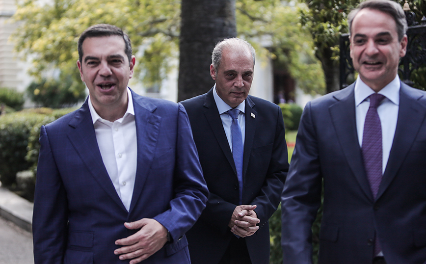 Σε δύο ομάδες προχώρησαν οι πολιτικοί αρχηγοί μετά το τέλος του Συμβουλίου στο Προεδρικό Μέγαρο. Οι μεν Κυριάκος Μητσοτάκης, Αλέξης Τσίπρας και Κυριάκος Βελόπουλος προχώρησαν μπροστά ενώ ακολουθούσαν σε απόσταση ο Δημήτρης Κουτσούμπας και ο Νίκος Ανδρουλάκης.