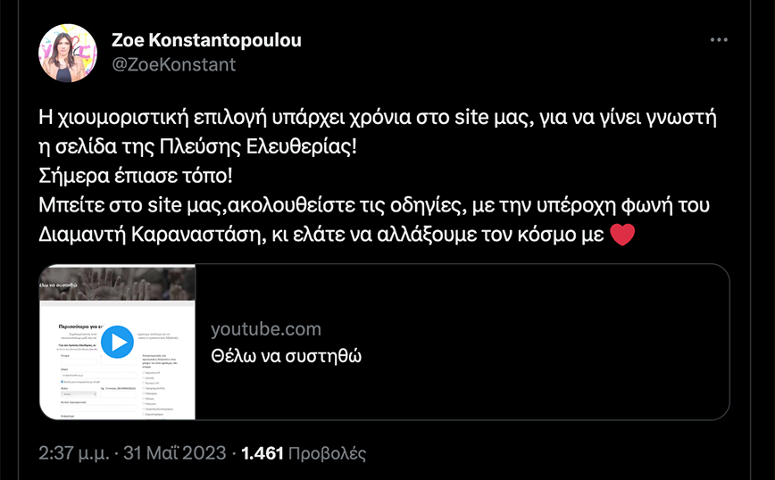 Δεν πρόκειται όμως περί λάθους, καθώς την απάντηση την έδωσε η ίδια η κ. Κωνσταντοπούλου, μέσω Twitter. Όπως έγραψε: «Η χιουμοριστική επιλογή υπάρχει χρόνια στο site μας, για να γίνει γνωστή η σελίδα της Πλεύσης Ελευθερίας!