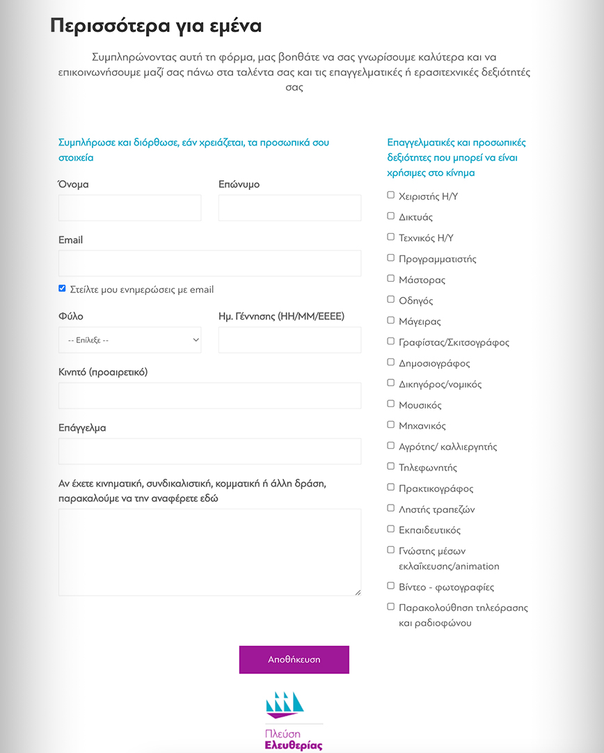Ειδικότερα, μπαίνοντας κανείς στην ηλεκτρονική σελίδα του κόμματος και ειδικότερα στην ενότητα «Θέλω να συστηθώ», ζητείται από τους πολίτες να συμπληρώσουν εάν το επιθυμούν τα στοιχεία τους. Αφού βάλουν ονοματεπώνυμο και ημερομηνία γέννησης, τους ζητείται να επιλέξουν τις «επαγγελματικές και προσωπικές δεξιότητες που μπορεί να είναι χρήσιμες στο κίνημα». Εκεί, εκτός από χειριστή ηλεκτρονικών υπολογιστών, μουσικό, δημοσιογράφο, δικηγόρο, μηχανικό, μάστορα, γραφίστα, εκπαιδευτικό και διάφορα άλλα επαγγέλματα, έχει και μια επιλογή… «ληστής τραπεζών».