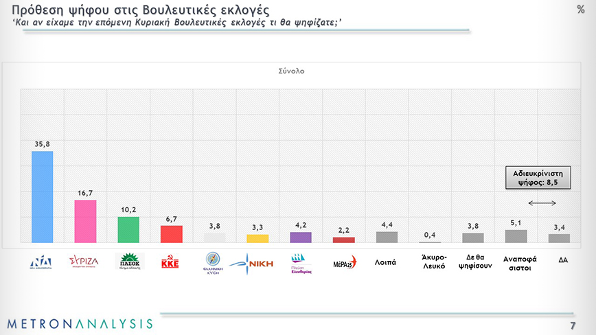 Συγκεκριμένα στην πρόθεση ψήφου, η Νέα Δημοκρατία καταγράφεται στο 35,8%, ενώ ο ΣΥΡΙΖΑ στο 16,7%. Ακολουθεί το ΠΑΣΟΚ με 10,2% και το ΚΚΕ με 6,7%. Η Πλεύση Ελευθερίας φαίνεται να ξεπερνά την Ελληνική Λύση με 4,2% έναντι 3,8% και η Νίκη να μπαίνει στη Βουλή με 3,3%.