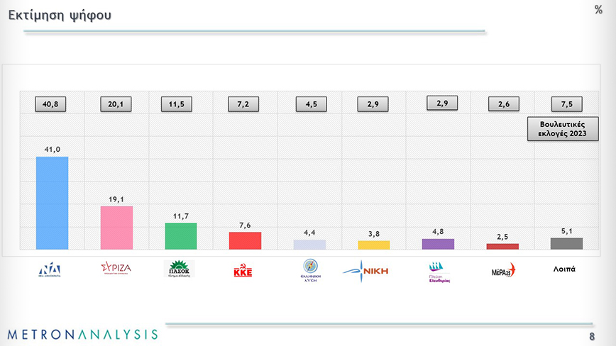 Στις 21,9 μονάδες μετρά τη διαφορά μεταξύ Νέας Δημοκρατίας και ΣΥΡΙΖΑ, η δημοσκόπηση της Metron Analysis για λογαριασμό του MEGA, στην εκτίμηση ψήφου.