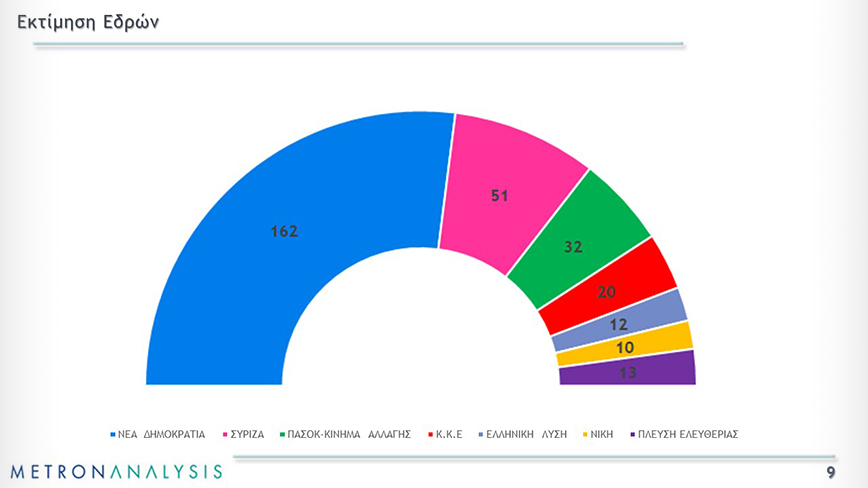 Σ’ αυτό το σενάριο, η Νέα Δημοκρατία εξασφαλίζει άνετη πλειοψηφία 162 βουλευτών. Ο ΣΥΡΙΖΑ πέφτει στις 51 έδρες, το ΠΑΣΟΚ στις 32, το ΚΚΕ στις 20, η Πλεύση Ελευθερίας 13, η Ελληνική Λύση 12 και η Νίκη 10.