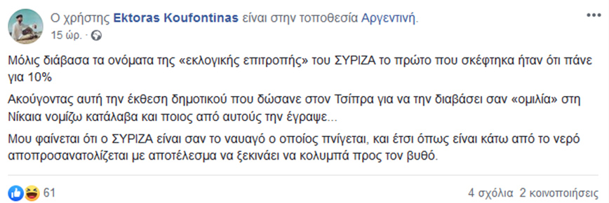 Η αρχική ανάρτησή του, από την Αργεντινή, όπως αναφέρει, έχει ως εξής: «Μόλις διάβασα τα ονόματα της «εκλογικής επιτροπής» του ΣΥΡΙΖΑ το πρώτο που σκέφτηκα ήταν ότι πάνε για 10% Ακούγοντας αυτή την έκθεση δημοτικού που δώσανε στον Τσίπρα για να την διαβάσει σαν «ομιλία» στη Νίκαια νομίζω κατάλαβα και ποιος από αυτούς την έγραψε… Μου φαίνεται ότι ο ΣΥΡΙΖΑ είναι σαν το ναυαγό ο οποίος πνίγεται, και έτσι όπως είναι κάτω από το νερό αποπροσανατολίζεται με αποτέλεσμα να ξεκινάει να κολυμπά προς τον βυθό» γράφει χαρακτηριστικά.