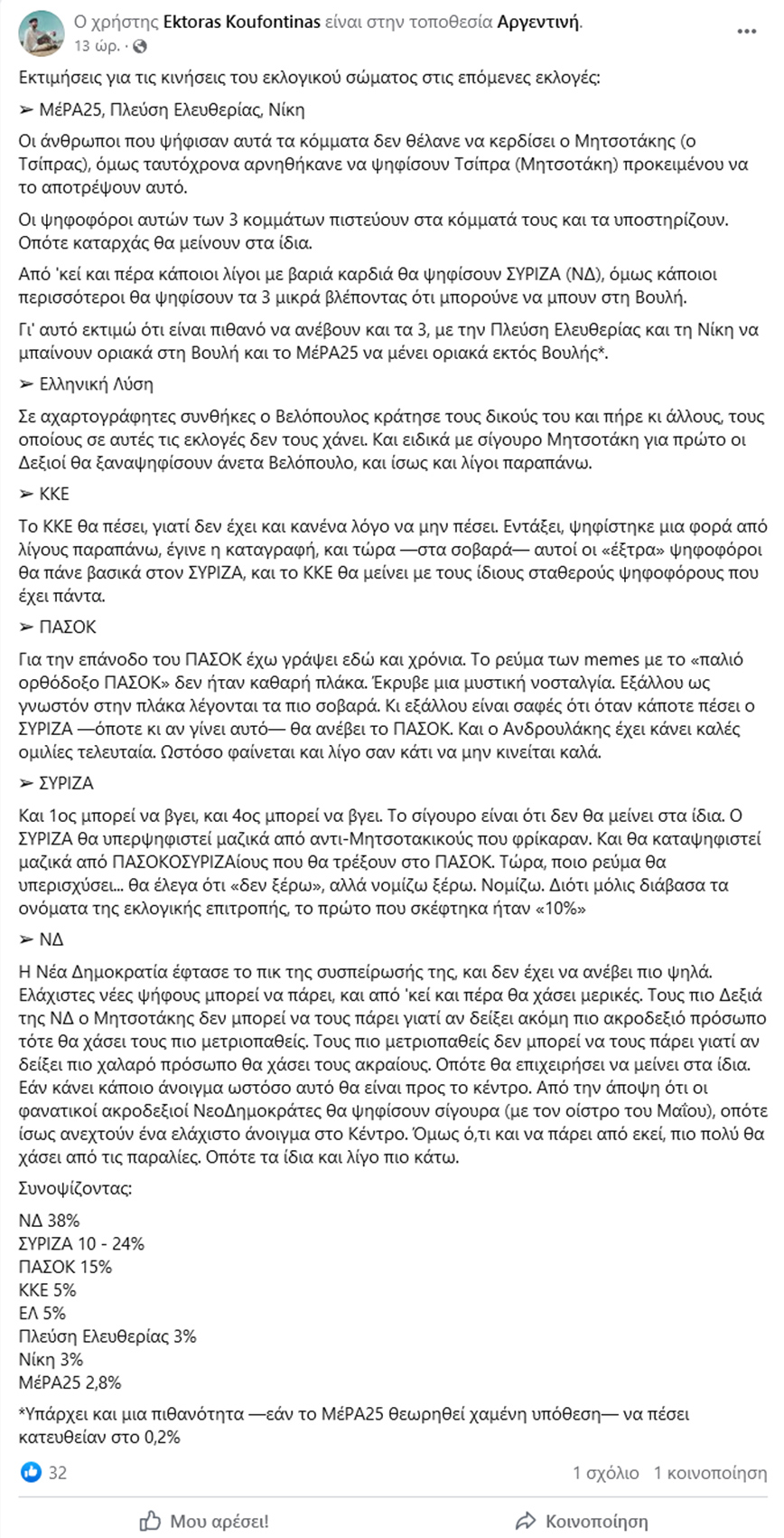 Ακολούθησε και δεύτερη ανάρτηση στην οποία έγραψε πως κατά την εκτίμησή του τα ποσοστά στις εκλογές της 25ης Ιουνίου θα είναι: ΝΔ 38%, ΣΥΡΙΖΑ 10 – 24%, ΠΑΣΟΚ 15%, ΚΚΕ 5%, ΕΛ 5%, Πλεύση Ελευθερίας 3%, Νίκη 3%, ΜέΡΑ25 2,8%.