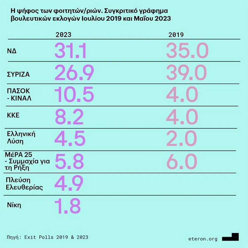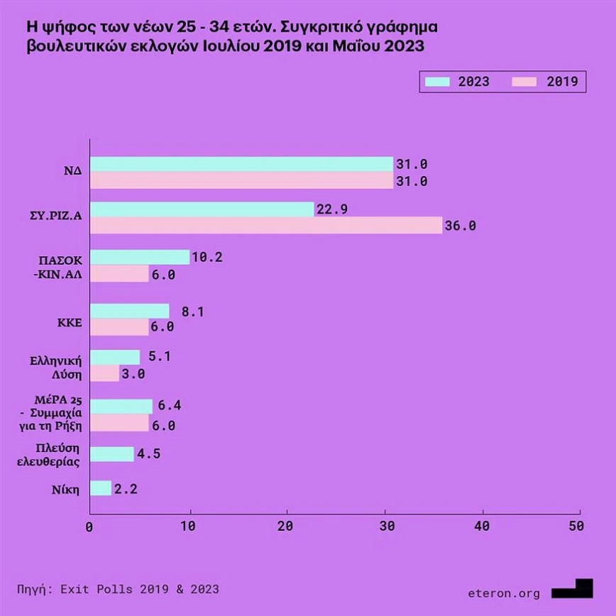 Τα παραπάνω στοιχεία προκύπτουν από τη συγκριτική καταγραφή των εκλογικών αποτελεσμάτων στη νέα γενιά, όπως προκύπτουν από τα exit polls στις βουλευτικές εκλογές του 2019 και του Μαΐου του 2023 που πραγματοποίησε το Eteron – Ινστιτούτο για την Έρευνα & την Κοινωνική Αλλαγή, στο πλαίσιο του project «Youth – Voice On».