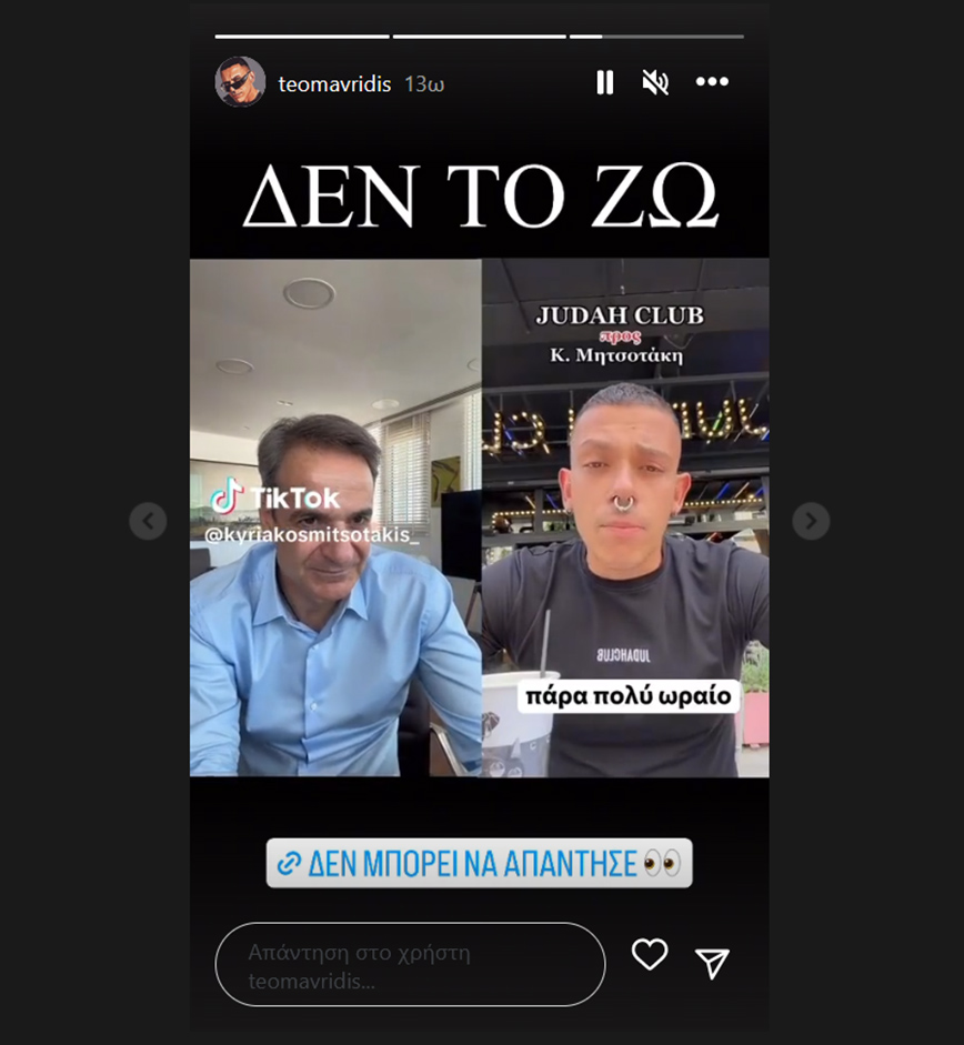 «Δεν το ζω, δεν μπορεί να απάντησε», έγραψε στο προφίλ του ο νεαρός επιχειρηματίας ο οποίος ανέβασε το βίντεο με την απάντηση του Κυριάκου Μητσοτάκη στον προσωπικό του λογαριασμό στο Instagram.