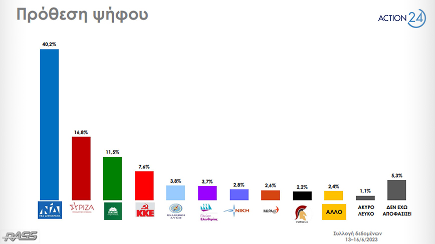 Προβάδισμα 23,4 ποσοστιαίων μονάδων της ΝΔ έναντι του ΣΥΡΙΖΑ εμφανίζει η δημοσκόπηση της RASS, που διενεργήθηκε για λογαριασμό του ACTION 24.