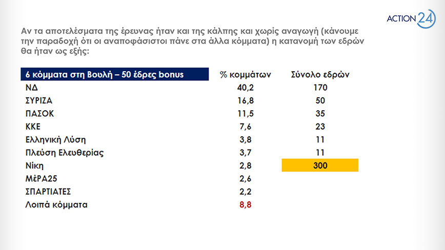 Σε ό,τι αφορά τις έδρες με 6 κόμματα στη Βουλή και χωρίς αναγωγή η κατανομή των εδρών θα είχε ως εξής: