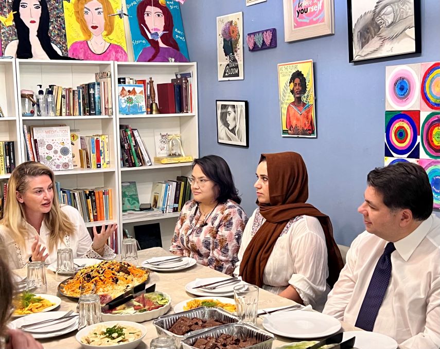 Καθισμένος στο μέσον του τραπεζιού πλάι στην Μπαχάρ, τη Μανίγια, τη Λέιλα και τη Σαντάφ από το Αφγανιστάν, τη Χαντίτζα από το Μαρόκο, τη Σβετλάνα από την Ουκρανία, ο πρέσβης των ΗΠΑ μοιράστηκε μαζί τους την ιστορία των γονιών του, που έφυγαν από την Ελλάδα και βρέθηκαν στην άλλη πλευρά του Ατλαντικού, κάνοντας ιδιαίτερη αναφορά στις ευκαιρίες που τούς δόθηκαν για να φτιάξουν μια καλύτερη ζωή για τους ίδιους και τα παιδιά τους. Μίλησε, όμως, και για τη Δημοκρατία, που «δεν αφορά μόνο τις περισσότερες ευκαιρίες και ελευθερίες, αλλά και τις αξίες που οικοδομούν μια κοινωνία των ίσων ευκαιριών» και ευχήθηκε κάθε ευτυχία και επιτυχία στην προσπάθειά των γυναικών αυτών να (ξανα)χτίσουν τη ζωή τους, σε μια νέα κοινωνία, με ασφάλεια κι αγάπη.