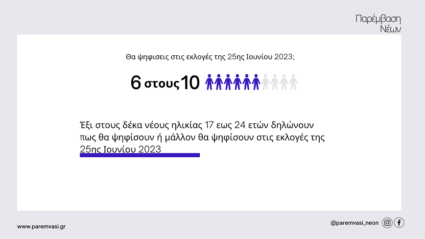 Σύμφωνα με τα αποτελέσματα της έρευνας για τις ηλικίες 17 έως 21 ετών το 58.9% δήλωσε ότι θα ψηφίσει ή μάλλον θα ψηφίσει στις εκλογές της 25ης Ιουνίου, το 32.6% πως δεν θα ψηφίσει η μάλλον δεν θα ψηφίσει ενώ το 5.5% δήλωσε πως δεν απαντά.