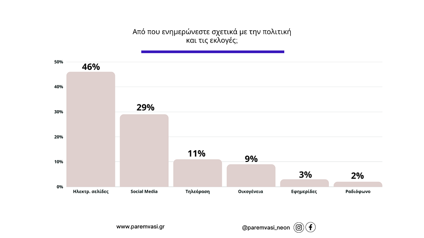 Σχετικά με το ερώτημα από που οι νέοι σήμερα έχουν ενημέρωση για την πολιτική επικαιρότητα και τις εκλογές, η απάντηση με ποσοστό 75% ήταν μέσα από το διαδίκτυο (ηλεκτρονικές σελίδες και social media) ενώ εφημερίδες και ραδιόφωνο απάντησε μόλις το 3% και 5% αντίστοιχα.