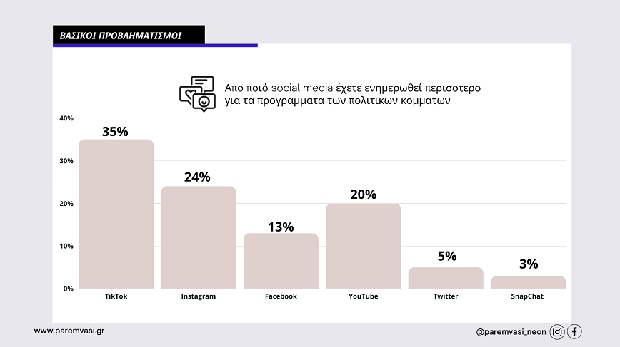 Τον τελευταίο καιρό έχει γίνει λόγος για την προβολή των προγραμμάτων των κομμάτων αλλά και των υποψηφίων μέσα από τα κοινωνικά δίκτυα. Στο ερώτημα ποιο από τα παρακάτω μέσα χρησιμοποιούν οι νέοι ηλικίας 17-21 ετών η απάντηση ήταν πως το 35% επιλέγει το TikTok, το 24% το Instagram, το 13% το Facebook, 20% το YouTube, το 5% το Twitter ενώ το 3% απάντησε το SnapChat.