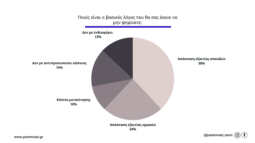 Στην περίπτωση που θα επέλεγαν να μην πάνε στην κάλπη και να μην συμμετέχουν στη διαδικασία των εκλογών ποιος θα ήταν ο κυριότερος λόγος ήταν το επόμενη ερώτημα της έρευνας της Παρέμβασης Νέων. Σε αυτή την περίπτωση η απάντηση ήταν: