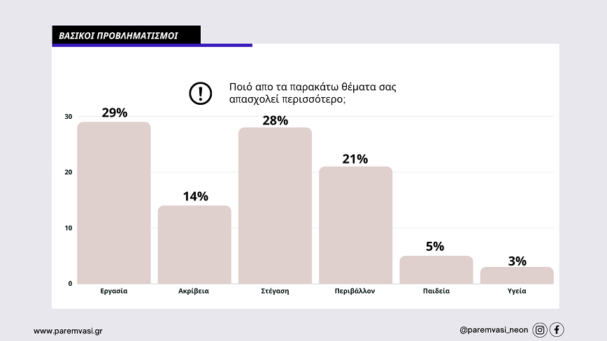 Το επόμενο ερώτημα αφορούσε τους προβληματισμούς και τα βασικά θέματα που απασχολούν την νέα γενιά όπου τα δύο σημαντικότερα βάση των απαντήσεων ήταν 29% η εργασία και 28% η στέγαση, δυο ζητήματα που όπως είδαμε δεν απασχολούν ιδιαίτερα τον δημόσιο διάλογο την προεκλογική περίοδο. Σημαντικό ποσοστό 21% απάντησε πως την απασχολούν ζητήματα για το Περιβάλλον ενώ το 14% η ακρίβεια.