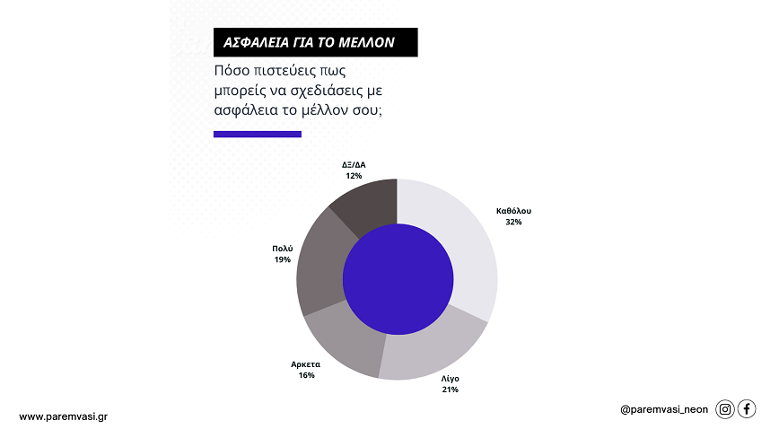 Τέλος, στο κατά πόσο πιστεύουν πως μπορούν να σχεδιάσουν με ασφάλεια το μέλλον τους η απάντηση ήταν Καθόλου 32%, Λίγο 21%, Αρκετά 16%, Πολύ 16%, ΔΞ/ΔΑ 12%.