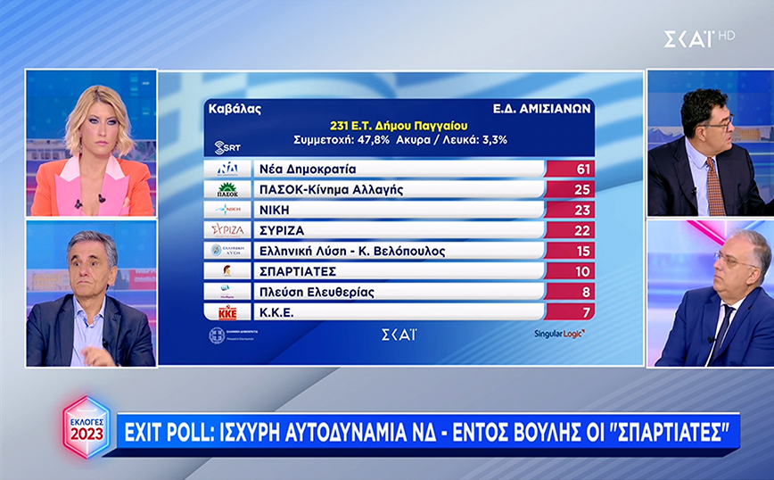 Στο 231 Ε.Τ του Δήμου Παγγαίου, η Νέα Δημοκρατία συγκεντρώνει 61, το ΠΑΣΟΚ 25, η Νίκη 23, ο ΣΥΡΙΖΑ 22, η Ελληνική Λύση 15, οι Σπαρτιάτες 10, η Πλεύση Ελευθερίας 8 και το ΚΚΕ 7