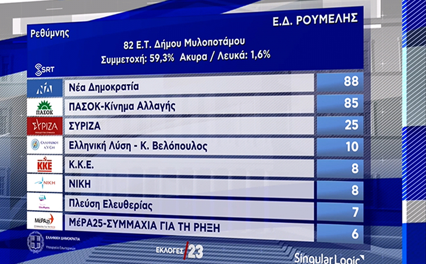 Στο 82 Ε.Τ του Δήμου Μυλοποτάμου, η Νέα Δημοκρατία συγκεντρώνει 88 ψήφους, το ΠΑΣΟΚ 85, ο ΣΥΡΙΖΑ 25, η Ελληνική Λύση 10, το ΚΚΕ 8, η Νίκη 8, η Πλεύση Ελευθερίας 7 και το Μέρα 25 6