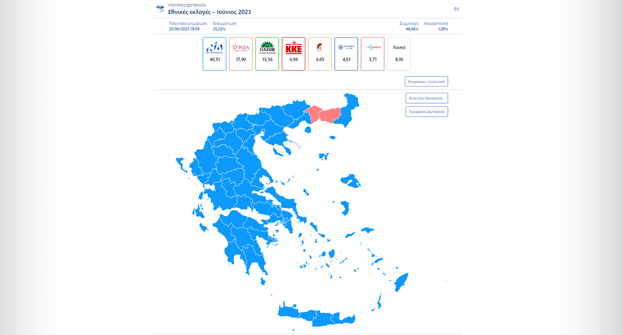 Κυριαρχία της ΝΔ, πτώση του ΣΥΡΙΖΑ και επτακομματική Βουλή δείχνουν τα πρώτα επίσημα αποτελέσματα των εκλογών της 25ης Ιουνίου του 2023.