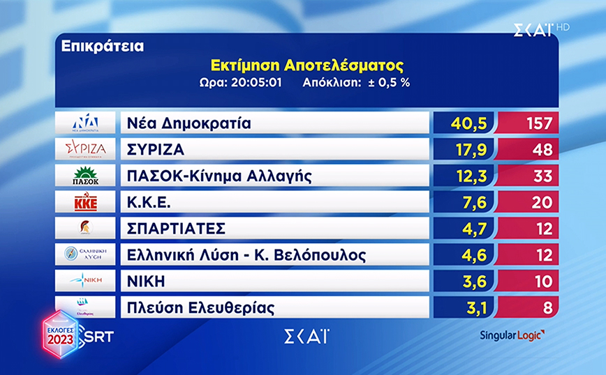 Συγκεκριμένα, σύμφωνα με την τελική εκτίμηση της Singular Logic, η Νέα Δημοκρατία λαμβάνει ποσοστό 40,5% και 157 έδρες. Ο ΣΥΡΙΖΑ βρίσκεται στο 17,9 και 48 έδρες. Το ΠΑΣΟΚ αναμένεται να βρεθεί στο 12,3% με 33 έδρες, το ΚΚΕ στο 7,6% με 20 έδρες, οι Σπαρτιάτες στο 4,7% με 12 έδρες, η Ελληνική Λύση στο 4,6% με 12 έδρες, η Νίκη στο 3,6% με 10 βουλευτές και η Πλεύση Ελευθερίας στο 3,1% με 8 βουλευτές.