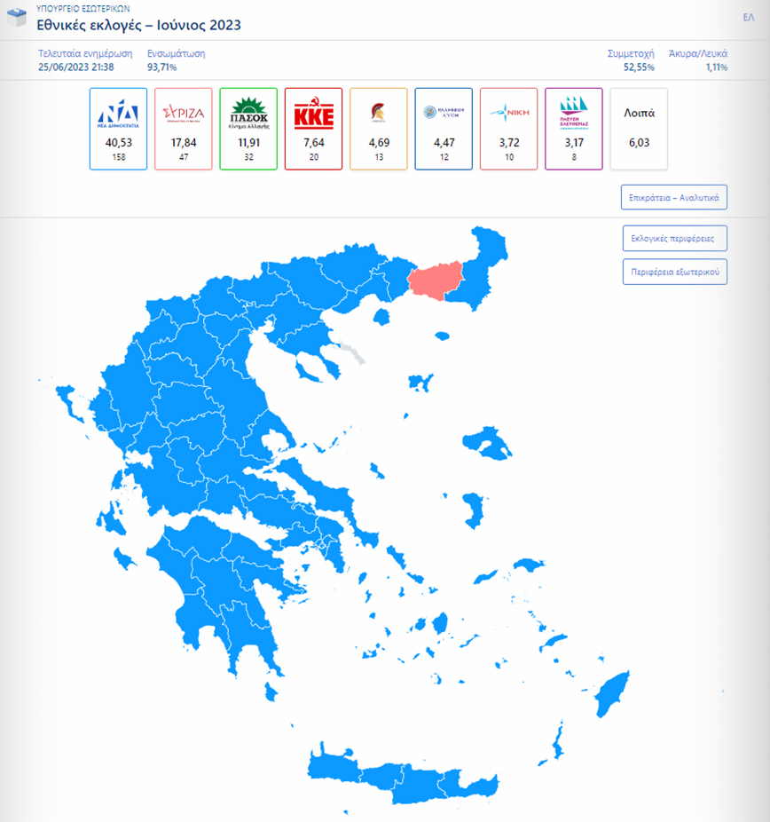 Η ενσωμάτωση στο 93,71% επιβεβαιώνει την εκτίμηση της Singular Logic. Συγκεκριμένα η ΝΔ συγκεντρώνει ποσοστό 40,53% (158 έδρες), ο ΣΥΡΙΖΑ 17,84% (47 έδρες), το ΠΑΣΟΚ 11,91% (32 έδρες), το ΚΚΕ 7,64% (20 έδρες), οι Σπαρτιάτες 4,69% (13 έδρες), η Ελληνική Λύση 4,47% (12 έδρες), η Νίκη 3,72% (10 έδρες) και η Πλεύση Ελευθερίας στο 3,17% (8 έδρες). Εκτός Βουλής μένει το ΜεΡΑ25. Η συμμετοχή ανέρχεται στο 52,55%.