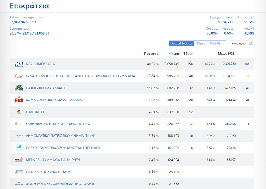 Με την ενσωμάτωση στο 96,5%, η «Φωνή Λογικής» της Αφροδίτης Λατινοπούλου πήρε 21.862 ψήφους (0,43%) με το κόμμα της να καταλαμβάνει την 11η θέση. Μια θέση πιο πάνω, στη 10η, βρέθηκε ο «Πατριωτικός Συνασπισμός» του Κωνσταντίνου Μπογδάνου συγκεντρώνοντας 25.185 ψήφους, αριθμός που αντιστοιχεί στο 0,5%.