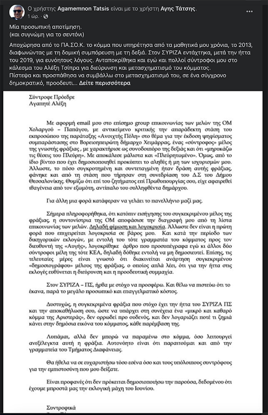 Αποχωρεί από τον ΣΥΡΙΖΑ ο Άγης Τάτσης, που υπήρξε σημαντικό στέλεχος του κόμματος, προερχόμενο από την Προοδευτική Συμμαχία, με αιχμές για τα αίτια της χθεσινής εκλογικής ήττας. Όπως τονίζει, μεταξύ άλλων, «από την πρώτη στιγμή βρέθηκα και βρεθήκαμε αντιμέτωποι στη σταθερή άρνηση της κομματικής γραφειοκρατίας να συμβάλει στη μετεξέλιξη. Άρνηση που συχνά έπαιρνε τη μορφή της χυδαιότητας και του παραλογισμού» προσθέτοντας πως «άνθρωποι, ανεπάγγελτοι, παντελώς ανίκανοι να διαχειριστούν και το πιο απλό πολιτικό ζήτημα, κράδαιναν ένα «αριστερόμετρο» με το οποίο προσπαθούσαν να μετρήσουν τον ίσκιο του καθενός. Μόνο που μετρούσαν τη σκιά τους το πρωί και όλων των άλλων το βράδυ».