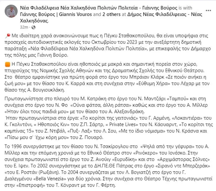«Με ιδιαίτερη χαρά ανακοινώνουμε πως η Πέγκυ Σταθακοπούλου, θα είναι υποψήφια στις προσεχείς αυτοδιοικητικές εκλογές του Οκτωβρίου του 2023 με την ανεξάρτητη δημοτική παράταξη “Νέα Φιλαδέλφεια Νέα Χαλκηδόνα Πολιτών Πολιτεία”, με επικεφαλής τον Δήμαρχο της πόλης μας Γιάννη Βούρο.