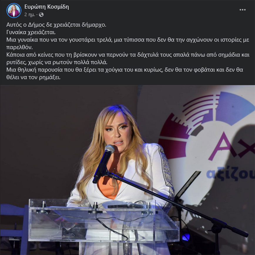 Δεν απομένει και πολύς καιρός για τις δημοτικές εκλογές και ο… αγώνας των υποψηφίων έχει ήδη ξεκινήσει. Όπως στην περίπτωση της Ευρώπης Κοσμίδη, η οποία είναι υποψήφια δήμαρχος Αχαρνών. Σε μια ανάρτησή της, η ίδια υποστηρίζει ότι ο δήμος δεν χρειάζεται δήμαρχο, αλλά «μια γυναίκα που να τον γουστάρει τρελά, μια τύπισσα που δεν θα την αγχώνουν οι ιστορίες με παρελθόν».
