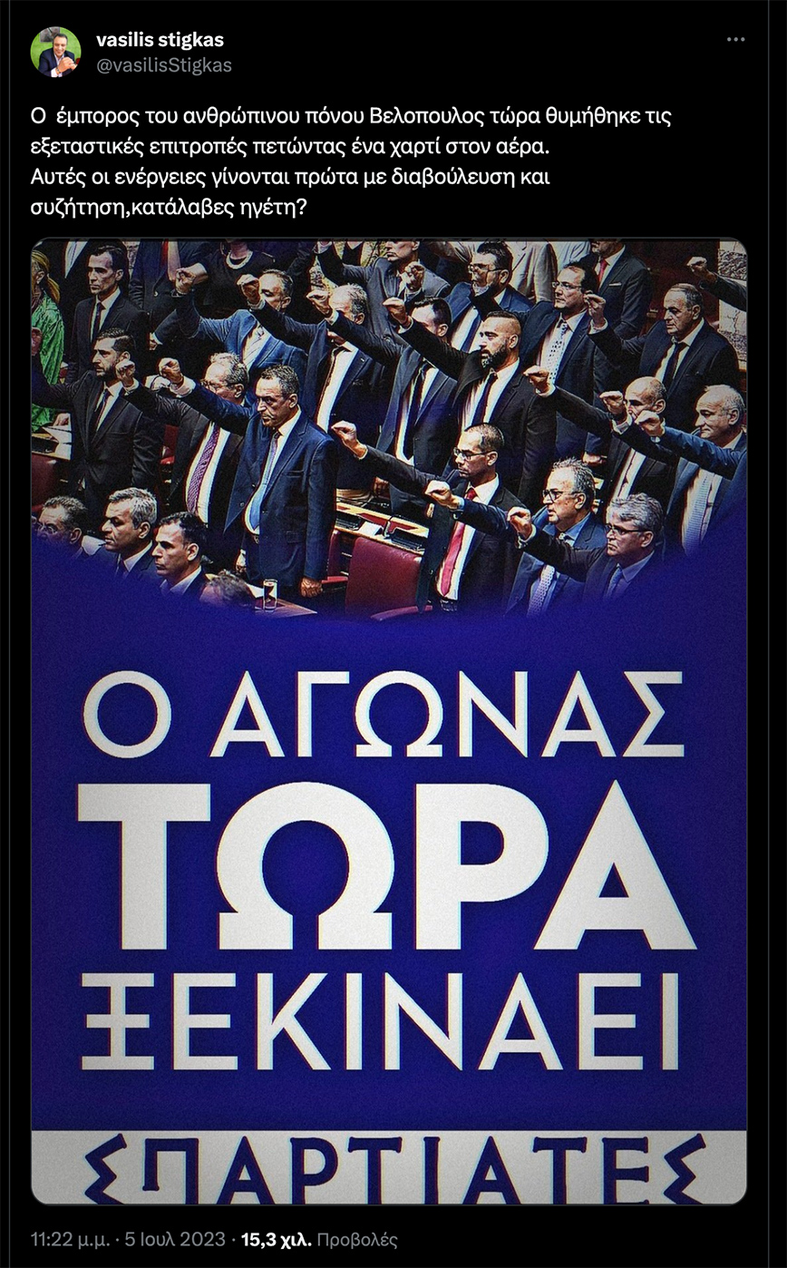 Αντιστοίχως αντίδραση στις αναρτήσεις Βελόπουλου υπήρξε και από τον κοινοβουλευτικό εκπρόσωπο των «Σπαρτιατών», Χάρη Κατσιβαρδά, ο οποίος με δήλωσή του ανέφερε ότι «ο Κος Βελόπουλος τρέφει χίμαιρες για ένα δήθεν ηγετικό ρόλο στον «πατριωτικό χώρο». Ζητά εξεταστική επιτροπή για μια χρονική περίοδο, που άνηκε ο ίδιος στη ΝΔ, πριν καν ιδρύσει το κόμμα του. Επίσης ζητά εξεταστική επιτροπή για την υποχρεωτικότητα των εμβολίων, με την οποία ο ίδιος συμφώνησε κι υπέγραψε (Πρακτικά της Βουλής, 10-3-2020, σελ 401-402)! Επιπροσθέτως, ο χαρακτηρισμός, για την προδήλως ετεροβαρή προς τα εθνικά συμφέροντα Συμφωνία των Πρεσπών, την οποία ο κος Βελόπουλος είχε αναφέρει κατά το πρόσφατο παρελθόν ως «καλή Συμφωνία» και ότι δεν ήταν δήθεν «προδοσία» επαναβαφτίστηκε μόλις εχθές Τρίτη 4 Ιουλίου 2023, ως «επαίσχυντη». Η υποκριτική πρωτοβουλία της σύστασης εξεταστικών επιτροπών ελήφθη αμιγώς για λόγους εντυπωσιασμού και άγρας δημοσιότητας άνευ ουσίας και σοβαρότητας. Λέμε «όχι» στην εκ του ασφαλούς πατριδοκαπηλία του κου Βελόπουλου!».