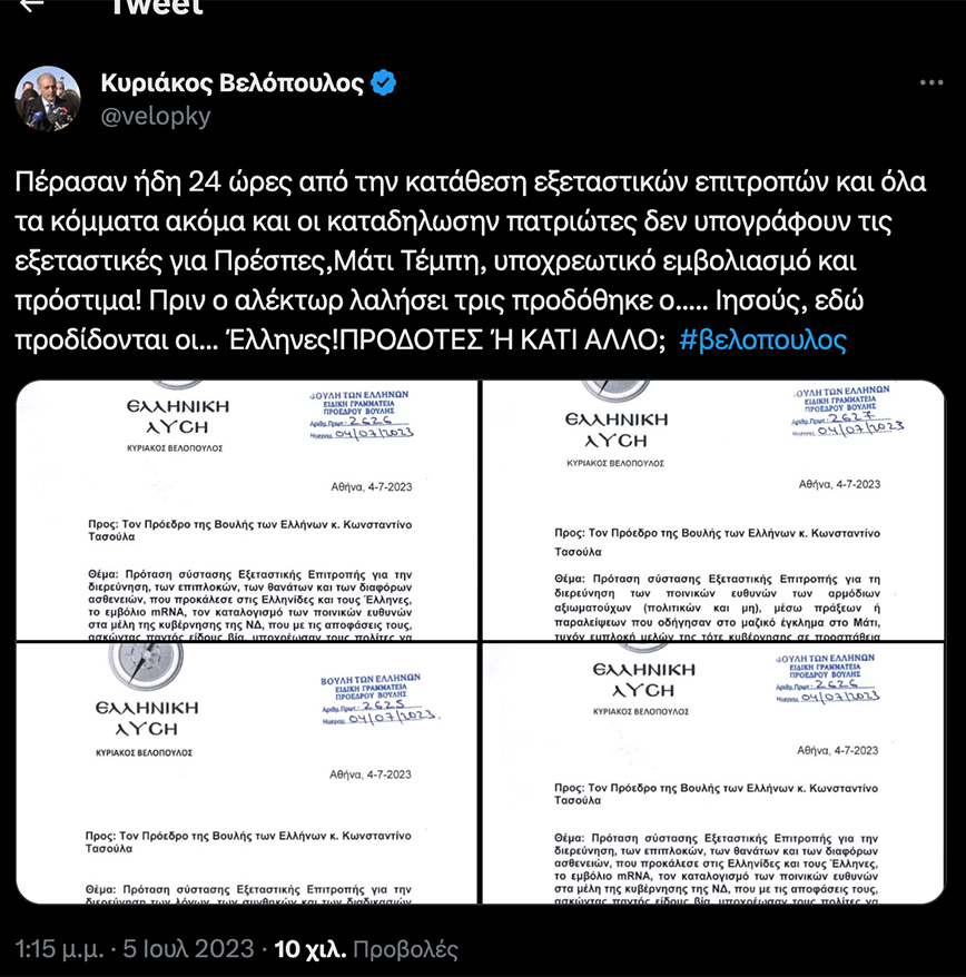 Μάλιστα ο κ. Βελόπουλος συνέχισε να ασκεί πίεση στους «Σπαρτιάτες» και με νέα του ανάρτηση στο Twitter εξηγεί γιατί η ελάσσων αντιπολίτευση έχει τη δυνατότητα να προκαλέσει τη σύσταση Εξεταστικών Επιτροπών. Γράφει χαρακτηριστικά: «ΑΠΟΚΆΛΥΨΗ ΣΕΙΣΜΌΣ…. ΓΙΑ ΝΑ ΤΕΛΕΙΏΝΟΥΝ ΤΑ ΠΑΡΑΜΎΘΙΑ ΑΥΤΩΝ ΠΟΥ ΑΠΟΦΕΥΓΟΥΝ ΝΑ ΨΗΦΙΣΟΥΝ ΤΙΣ ΕΞΕΤΑΣΤΙΚΕΣ, ΛΕΜΕ ΟΤΙ ΣΚΟΠΟΣ ΜΑΣ ΕΙΝΑΙ ΝΑ ΣΥΡΟΥΜΕ…. ΠΙΣΩ ΜΑΣ ΤΟΥΣ ΒΟΥΛΕΥΤΈΣ ΤΗΣ ΝΈΑΣ ΔΗΜΟΚΡΑΤΊΑΣ ΚΥΡΙΩΣ ΤΗΣ ΜΑΚΕΔΟΝΙΑΣ, ΑΦΟΥ ΕΙΧΑΜΕ ΔΕΔΟΜΕΝΟ ΟΤΙ ΘΑ ΨΗΦΙΣΟΥΝ ΟΣΟΙ ΔΗΛΩΝΟΥΝ ΠΑΤΡΙΩΤΕΣ: Κατά την τελευταία αναθεώρηση του Συντάγματος, δόθηκε ένα δικαίωμα στην ελάσσονα αντιπολίτευση. Συγκεκριμένα, αναθεωρήθηκε και το άρθρο 68, το οποίον πλέον στην παρ. 2 εδ. γ΄, αναφέρει ότι: «Η Βουλή μπορεί να συνιστά δύο ανά κοινοβουλευτική περίοδο εξεταστικές επιτροπές, εφόσον η σχετική πρόταση δέκα τουλάχιστον βουλευτών υπερψηφισθεί από τα δύο πέμπτα του συνόλου των βουλευτών (120), ανεξαρτήτως πλειοψηφίας». Με λίγα λόγια, με πρόταση 10 τουλάχιστον βουλευτών, διεξάγεται συζήτηση στην Ολομέλεια για τη σύσταση εξεταστικής επιτροπής και αυτή αποφασίζεται (μετά από συζήτηση) αν την ψηφίσουν 120 τουλάχιστον βουλευτές. Δηλαδή ΔΕΝ ΜΠΟΡΕΙ να την μπλοκάρει η κυβερνητική πλειοψηφία, αν ψηφίσουν 120 βουλευτές» ανέφερε μεταξύ άλλων ο πρόεδρος της Ελληνικής Λύσης για να προσθέσει σε άλλο σημείο « ΌΠΟΙΟΣ ΘΈΛΕΙ ΝΑ ΚΑΤΑΛΆΒΕΙ, ΚΑΤΑΛΑΒΑΊΝΕΙ! Το θέμα λοιπόν είναι ότι φθηνές δικαιολογίες δεν χωρούν! Κάποιοι δεν αφήνουν αυτούς που δηλώνουν πατριώτες να ψηφίσουν τις εξεταστικές επιτροπές! Αυτή είναι η αλήθεια! Ή είστε με την Ελλάδα και τη Μακεδονία ή δεν είστε κύριοι!».