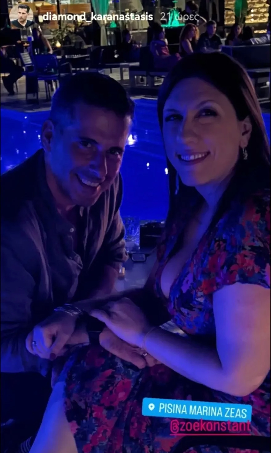 Ένα ρομαντικό καλοκαιρινό βράδυ παρέα με τον σύντροφό της, ηθοποιό και σκηνοθέτη Διαμαντή Καραναστάση πέρασε η πρόεδρος της Πλεύσης Ελευθερίας, Ζωή Κωνσταντοπούλου. Το ζευγάρι επέλεξε να απολαύσει το ποτό του σε γνωστό μαγαζί στη Μαρίνα Ζέας, στον Πειραιά, δίπλα στην πισίνα, όπως μαρτυρά και η σχετική φωτογραφία που ανάρτησε στα μέσα κοινωνικής δικτύωσης ο καλλιτέχνης και βουλευτής πλέον του κόμματος το οποίο συνίδρυσε με τη σύντροφό του.
