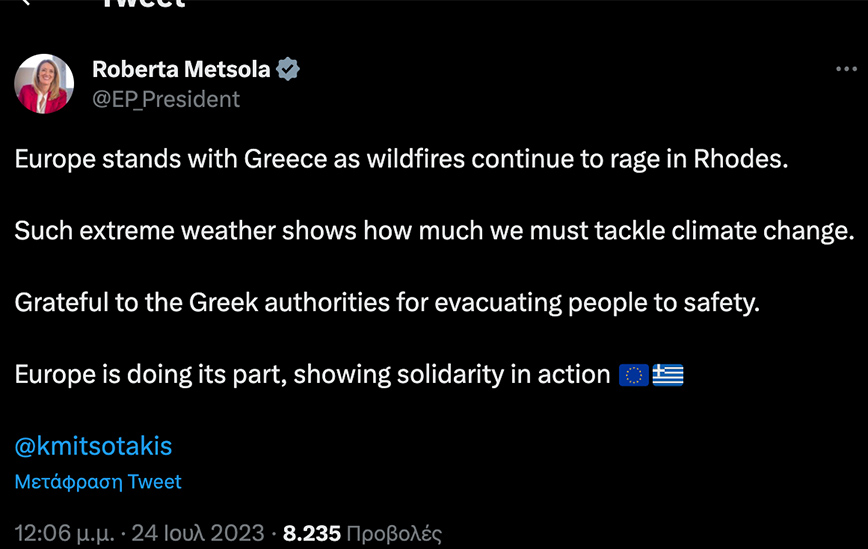 Ειδικότερα, γράψει (στα αγγλικά) η κα Μετσόλα: «Η Ευρώπη στέκεται δίπλα στην Ελλάδα, καθώς οι πυρκαγιές μαίνονται στη Ρόδο.