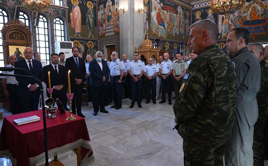 Στην τελετή στο στρατόπεδο «Παπάγου», στο υπουργείο Εθνικής Άμυνας, «παρευρέθηκαν όλα τα μέλη της πολιτικής και φυσικής ηγεσίας των Ενόπλων Δυνάμεων, ενώ ακολούθησε επιμνημόσυνη δέηση υπέρ αναπαύσεως των ψυχών των δύο αξιωματικών της Πολεμικής Αεροπορίας, στον Ιερό Ναό της Παναγίας», προσθέτει ο κ. Δένδιας.