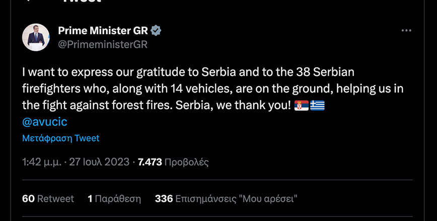 Με ένα tweet στην αγγλική γλώσσα ο πρωθυπουργός Κυριάκος Μητσοτάκης θέλησε να εκφράσει την ευγνωμοσύνη εκ μέρους της ελληνικής κυβέρνησης στη Σερβία, για τους πυροσβέστες που έστειλε στη χώρα μας ώστε να βοηθήσουν και να σβήσουν οι φωτιές που μαίνονταν ανά την επικράτεια.