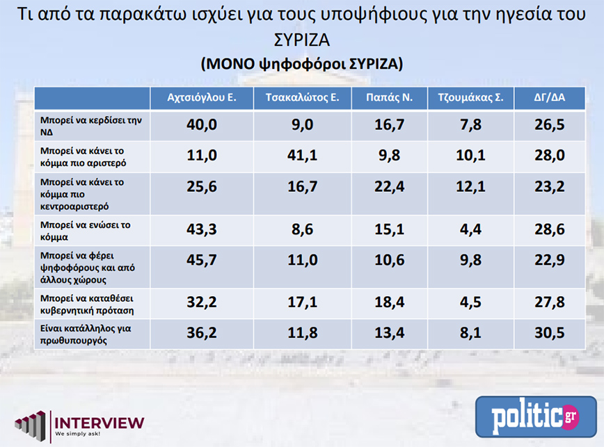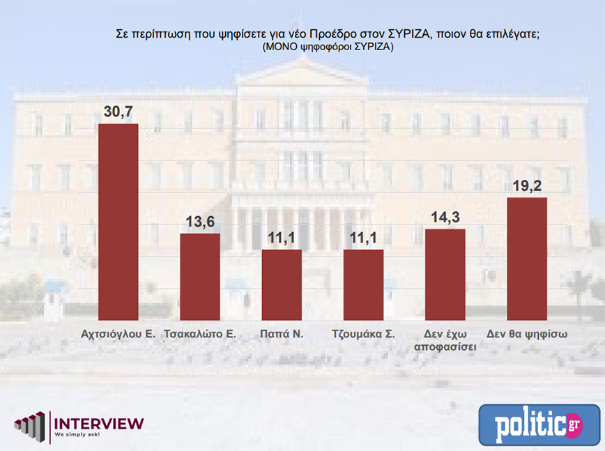 Αναλυτικότερα, στην ερώτηση «ποιον θα ψηφίσετε για νέο πρόεδρο» η Έφη Αχτσιόγλου είναι πρώτη με ποσοστό 30,7%, ο Ευκλείδης Τσακαλώτος δεύτερος με 13,6%, ενώ ο Νίκος Παππάς και ο Στέφανος Τζουμάκας είναι στην τρίτη θέση με ποσοστό 11,1%. Οι αναποφάσιστοι είναι στο 14,3% και αυτοί που δηλώνουν πως δεν θα ψηφίσουν είναι στο 19,2%.